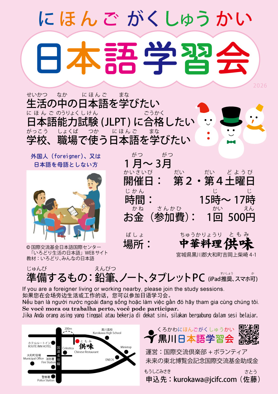 宮城県大和町内で毎月2回開催している日本語学習会に日本語教員が出張しています。